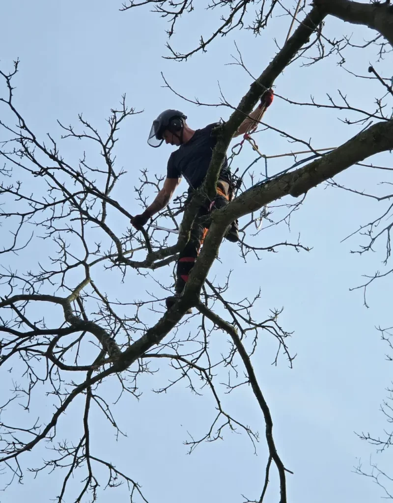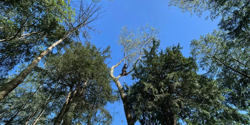 Les interventions sont effectuées par un grimpeur-élagueur qualifié, formé et équipé pour les travaux en hauteur. Cette expertise est essentielle lorsque l’arbre se trouve à proximité d’une habitation, d’une clôture ou de fils électriques, par exemple.